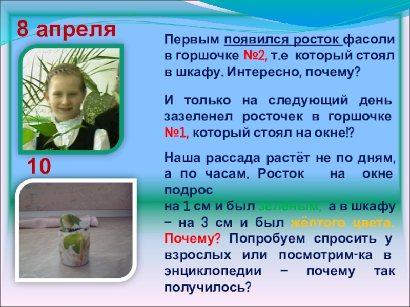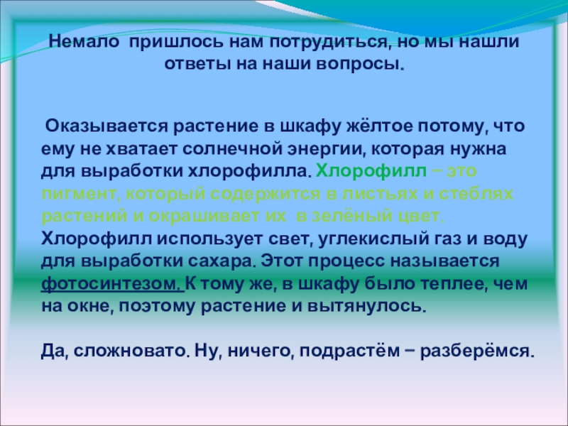 на 1 см и был зелёным, а в шкафу – на 3 см и был жёлтого цвета. Почему? Попробуем спросить у взрослых или посмотрим-ка в энциклопедии – почему так получилось?