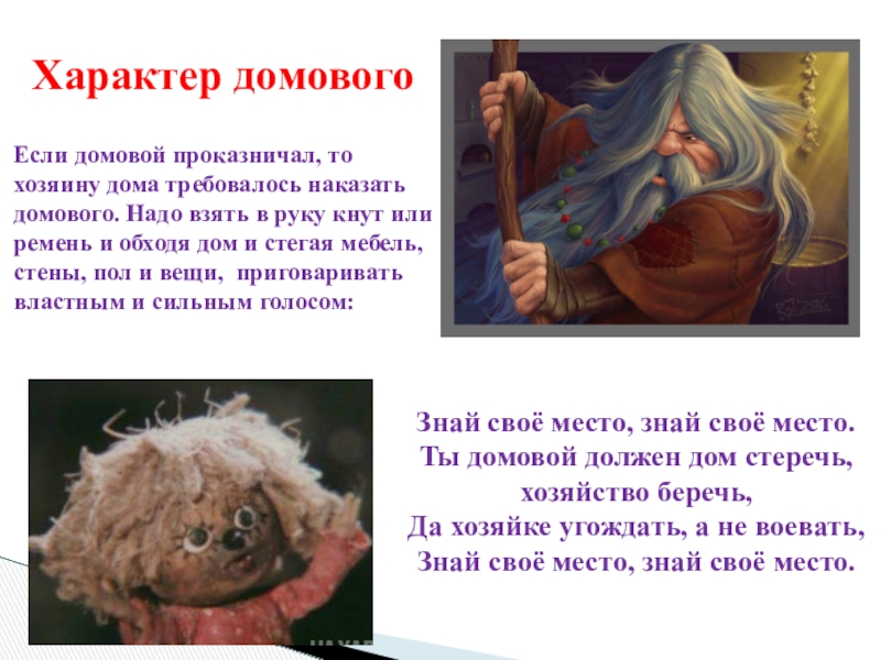 Если домовой проказничал, то хозяину дома требовалось наказать домового. Надо взять в руку кнут или ремень и обходя дом и стегая мебель, стены, пол и вещи, приговаривать властным и сильным голосом:
