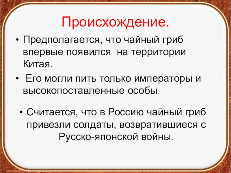 Считается, что в Россию чайный гриб привезли солдаты, возвратившиеся с Русско-японской войны.