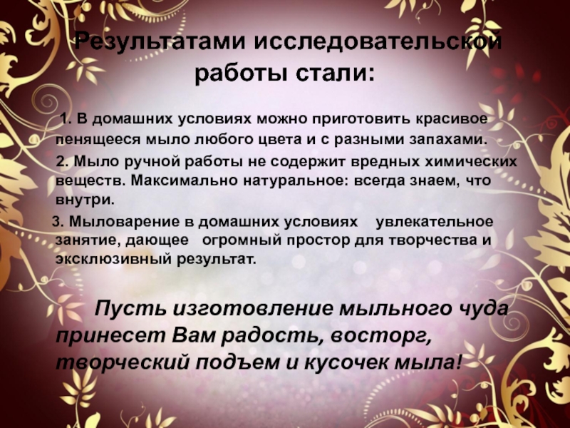 Пусть изготовление мыльного чуда принесет Вам радость, восторг, творческий подъем и кусочек мыла!