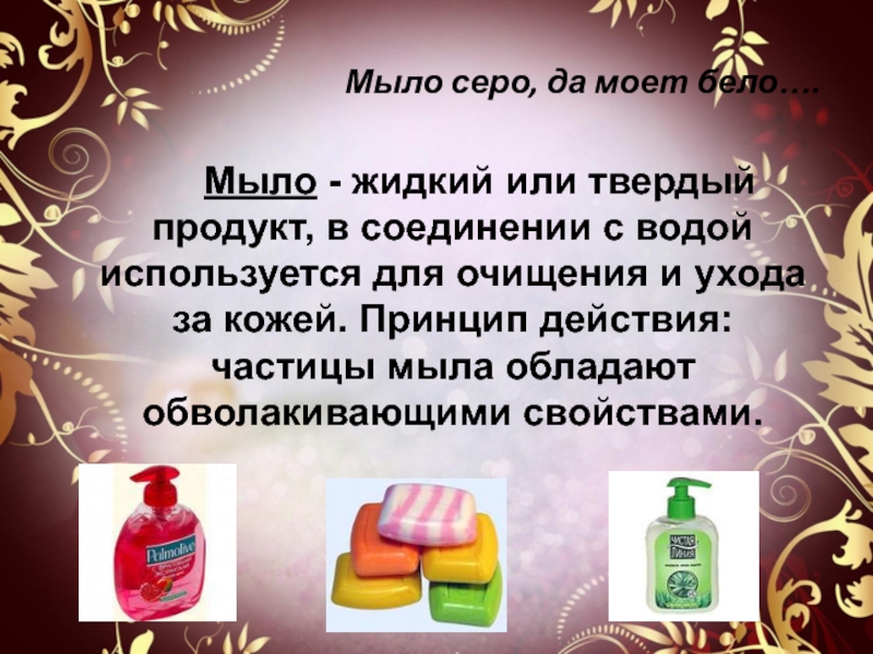 жидкий или твердый продукт, в соединении с водой используется для очищения и ухода за кожей. Принцип действия: частицы мыла обладают обволакивающими свойствами.