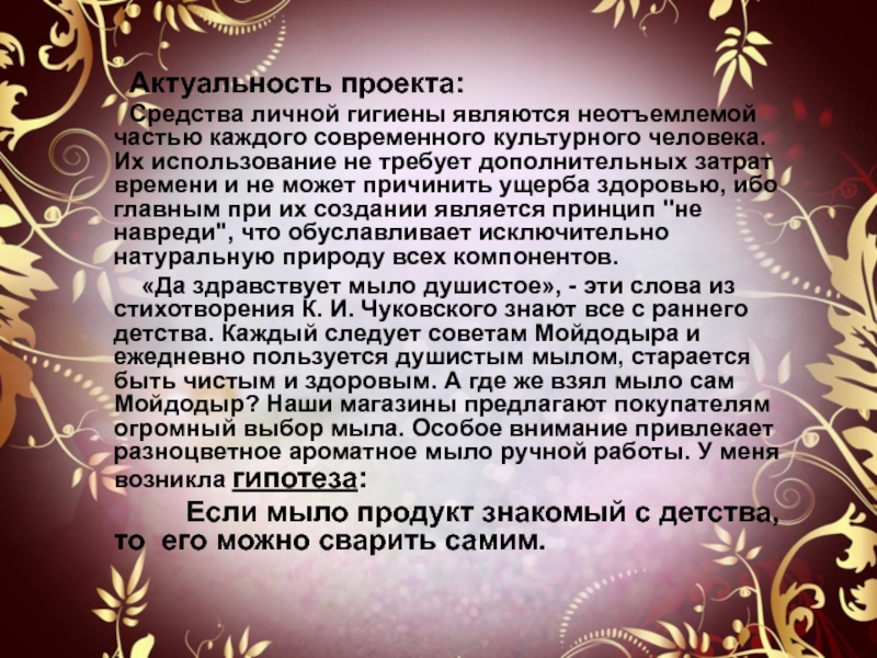 «Да здравствует мыло душистое», - эти слова из стихотворения К. И. Чуковского знают все с раннего детства. Каждый следует советам Мойдодыра и ежедневно пользуется душистым мылом, старается быть чистым и здоровым. А где же взял мыло сам Мойдодыр? Наши магазины предлагают покупателям огромный выбор мыла. Особое внимание привлекает разноцветное ароматное мыло ручной работы. У меня возникла гипотеза: