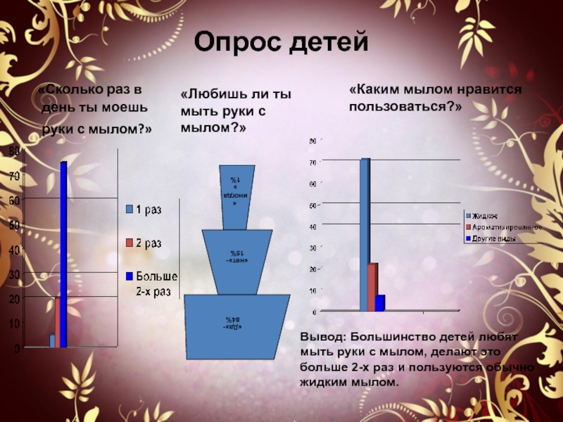 Вывод: Большинство детей любят мыть руки с мылом, делают это больше 2-х раз и пользуются обычно жидким мылом.