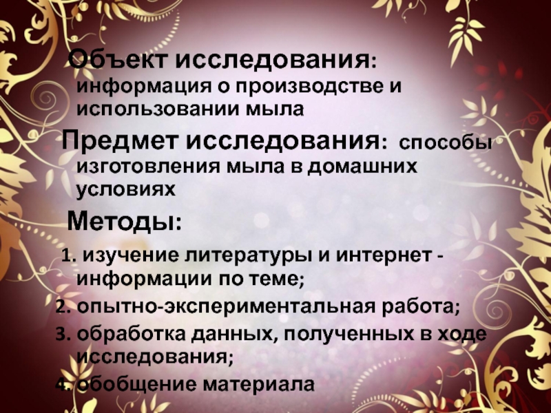 Слайд 4 Объект исследования: информация о производстве и использовании мыла