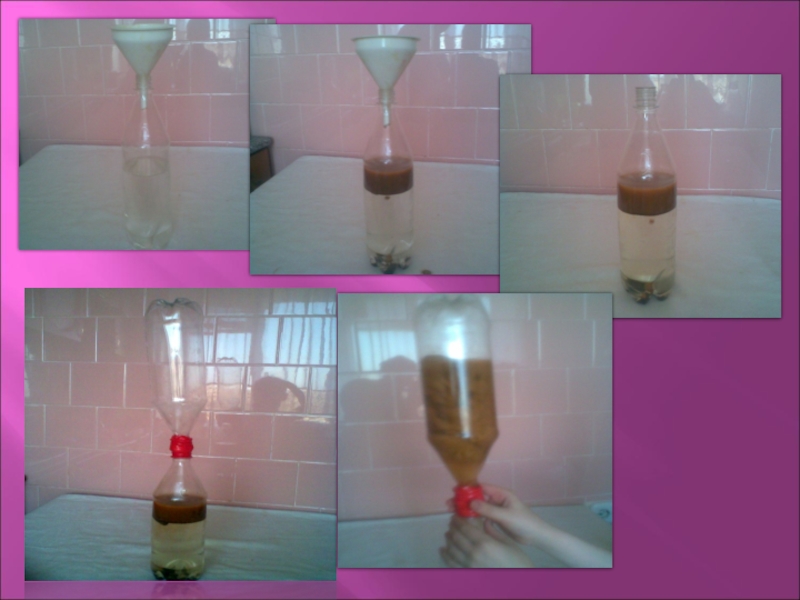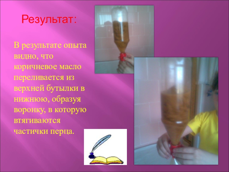 Результат:В результате опыта видно, что коричневое масло переливается из верхней бутылки в нижнюю, образуя воронку, в которую