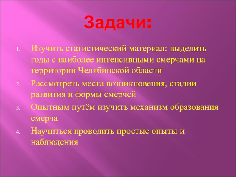 Задачи:Изучить статистический материал: выделить годы с наиболее интенсивными смерчами на территории Челябинской областиРассмотреть места возникновения, стадии развития