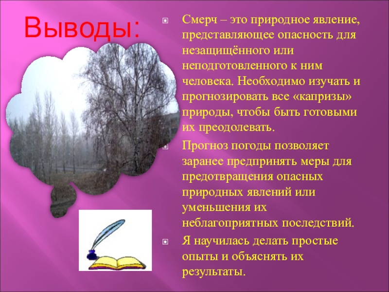 Выводы:Смерч – это природное явление, представляющее опасность для незащищённого или неподготовленного к ним человека. Необходимо изучать и