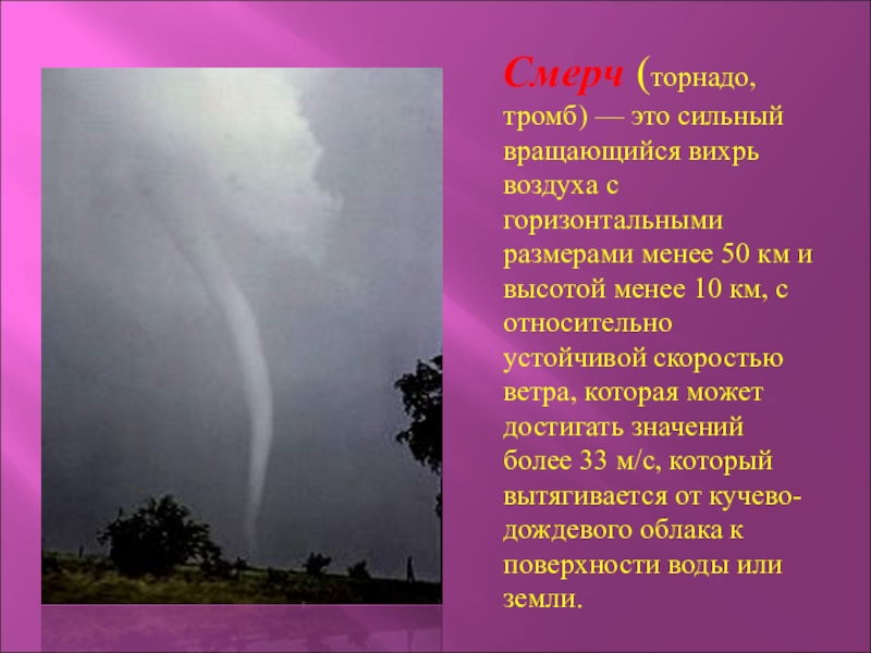 Смерч (торнадо, тромб) — это сильный вращающийся вихрь воздуха с горизонтальными размерами менее 50 км