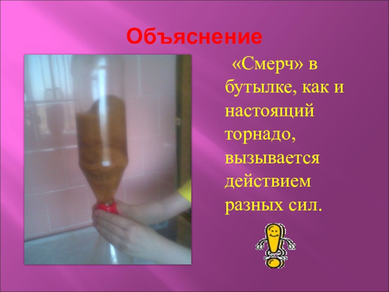 Объяснение   «Смерч» в бутылке, как и настоящий торнадо, вызывается действием разных сил.