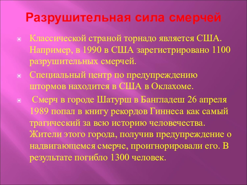 Разрушительная сила смерчейКлассической страной торнадо является США. Например, в 1990 в США зарегистрировано 1100 разрушительных смерчей. Специальный