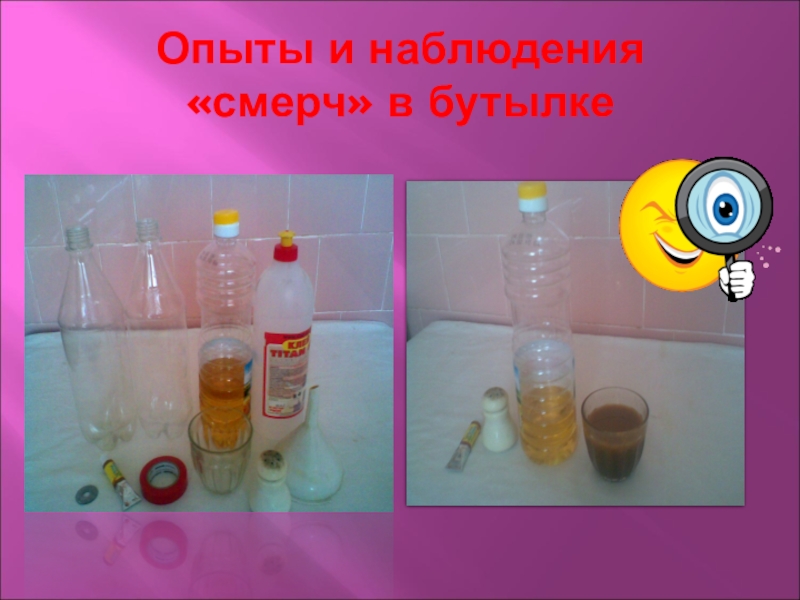 Слайд 12Опыты и наблюдения «смерч» в бутылке