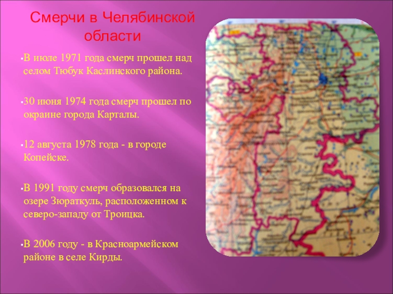 Смерчи в Челябинской областиВ июле 1971 года смерч прошел над селом Тюбук Каслинского района. 30 июня 1974 года смерч прошел по окраине города Карталы.12 августа 1978 года - в городе Копейске.В 1991 году смерч образовался на