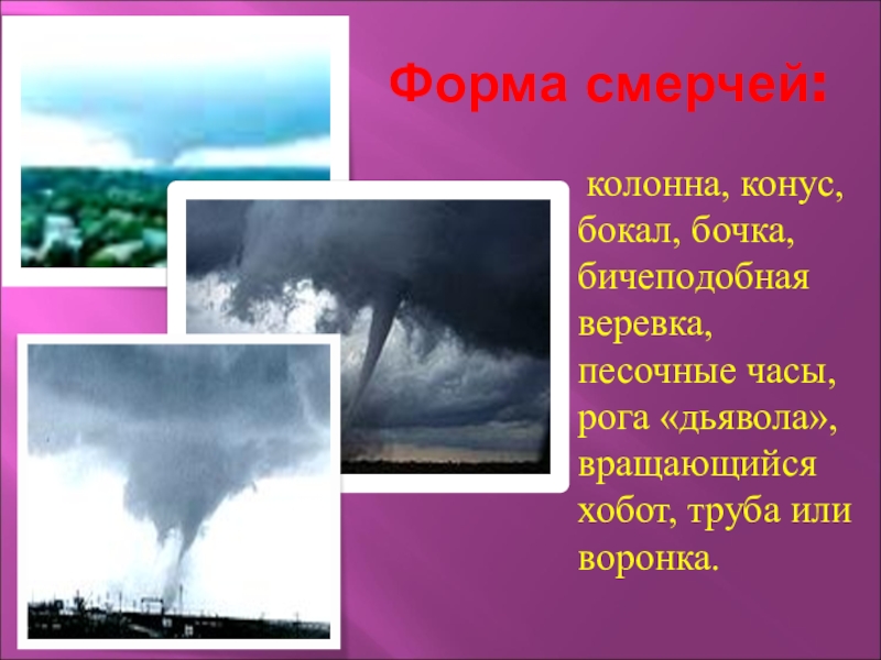 Форма смерчей:   колонна, конус, бокал, бочка, бичеподобная веревка, песочные часы, рога «дьявола», вращающийся хобот, труба