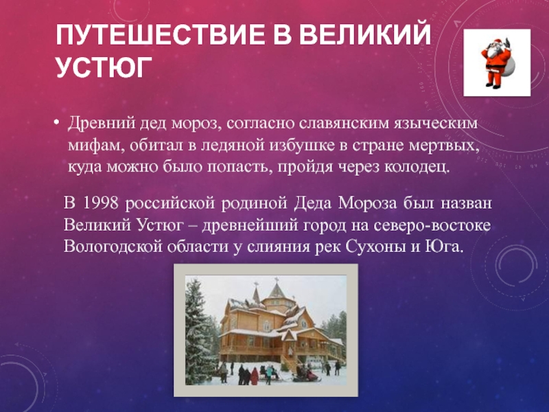 В 1998 российской родиной Деда Мороза был назван Великий Устюг – древнейший город на северо-востоке Вологодской области у слияния рек Сухоны и Юга.