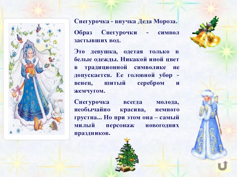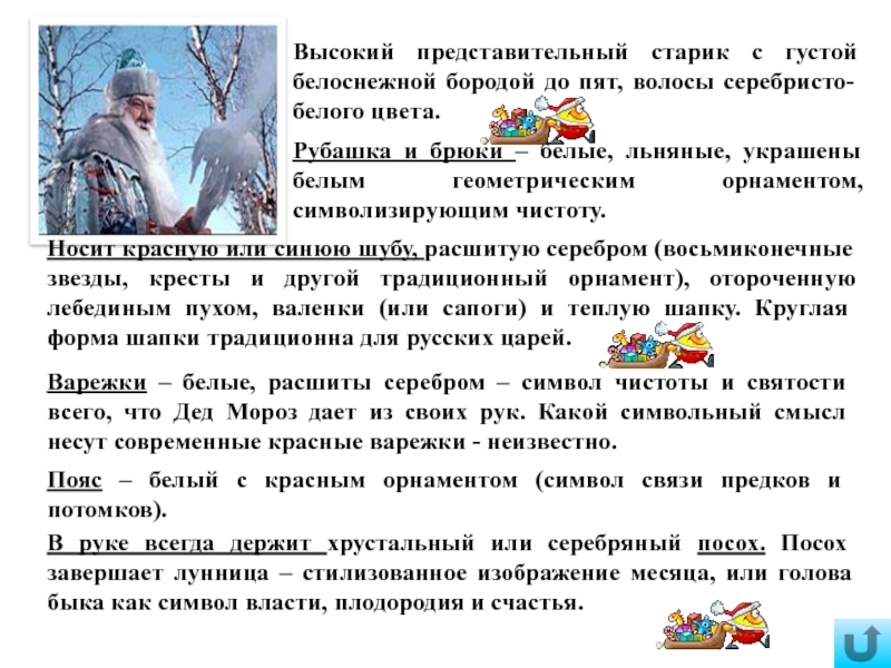 Варежки – белые, расшиты серебром – символ чистоты и святости всего, что Дед Мороз дает из своих рук. Какой символьный смысл несут современные красные варежки - неизвестно.