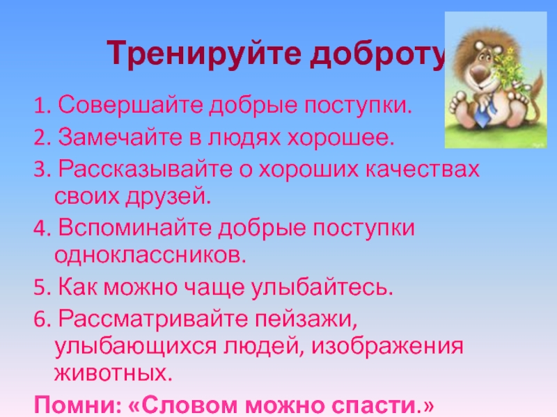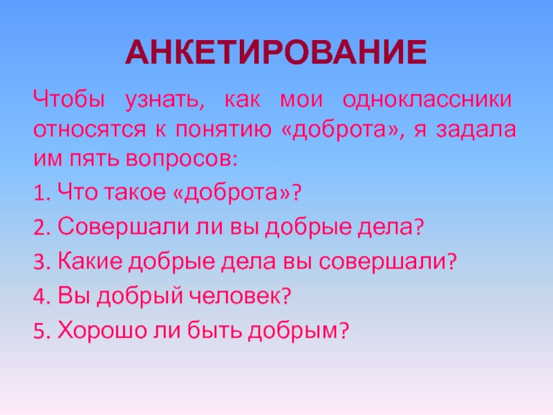 Доброта – это веселье, радость, ласка, любовь, дружба, уважение. Так ответили 22 человека.