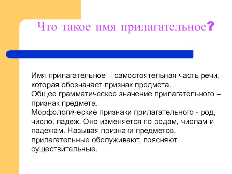 Морфологические признаки прилагательного - род, число, падеж. Оно изменяется по родам, числам и падежам. Называя признаки предметов, прилагательные обслуживают, поясняют существительные.