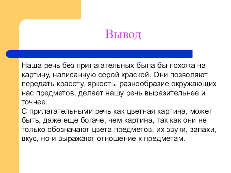 Наша речь без прилагательных была бы похожа на картину, написанную серой краской. Они позволяют передать красоту, яркость, разнообразие окружающих нас предметов, делает нашу речь выразительнее и точнее.