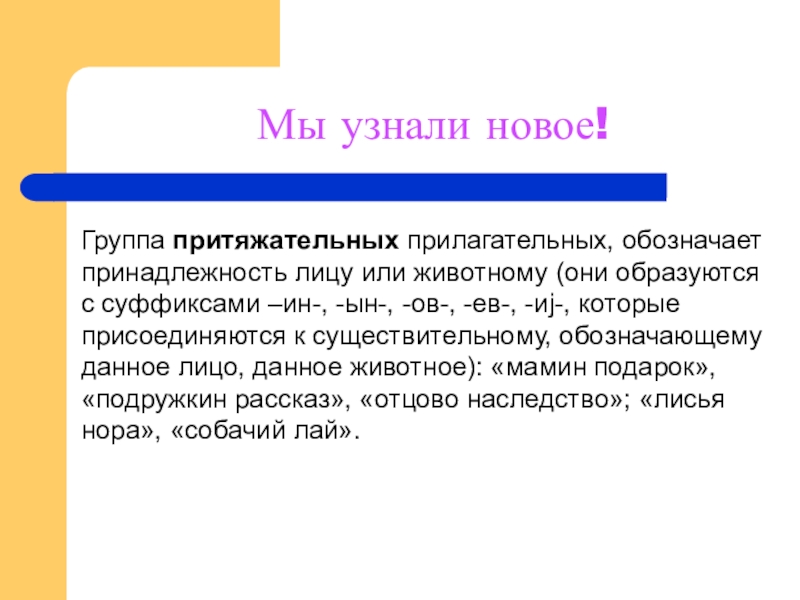 Группа притяжательных прилагательных, обозначает принадлежность лицу или животному (они образуются с суффиксами –ин-, -ын-, -ов-, -ев-, -иj-, которые присоединяются к существительному, обозначающему данное лицо, данное животное): «мамин подарок», «подружкин рассказ», «отцово наследство»; «лисья нора», «собачий лай».