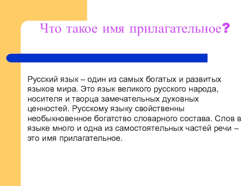 Русский язык – один из самых богатых и развитых языков мира. Это язык великого русского народа, носителя и творца замечательных духовных ценностей. Русскому языку свойственны необыкновенное богатство словарного состава. Слов в языке много и одна из самостоятельных частей речи – это имя прилагательное.