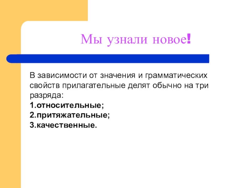 В зависимости от значения и грамматических свойств прилагательные делят обычно на три разряда: