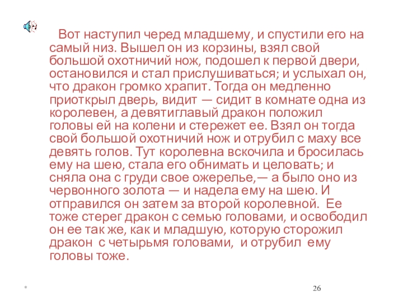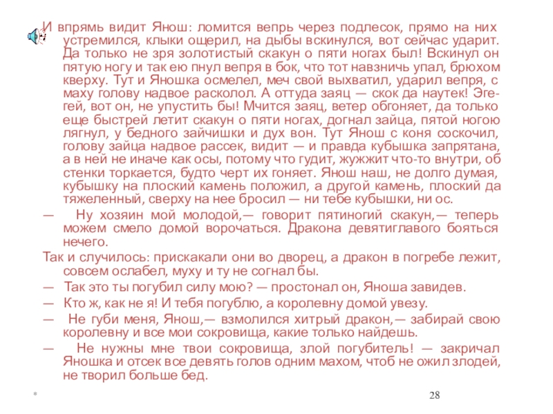 — Не губи меня, Янош,— взмолился хитрый дракон,— забирай свою королевну и все мои сокровища, какие только найдешь.