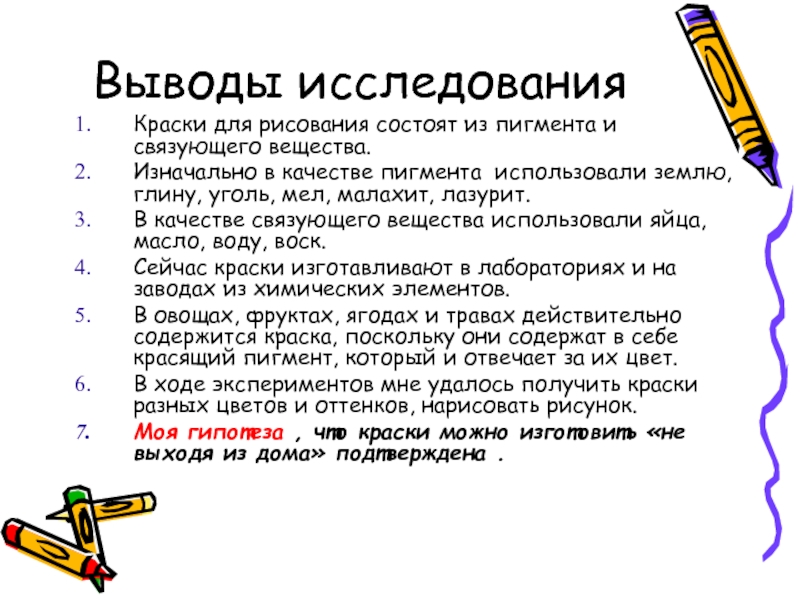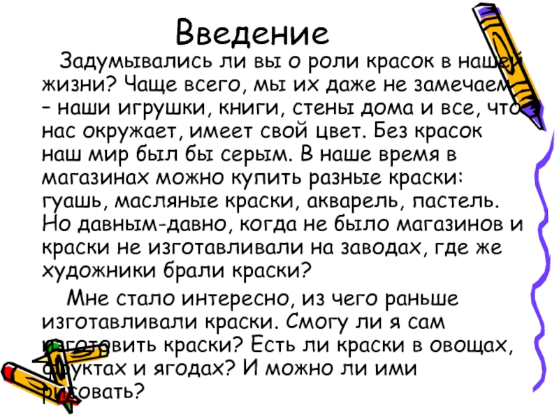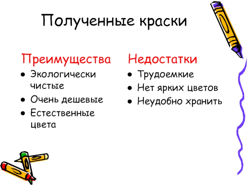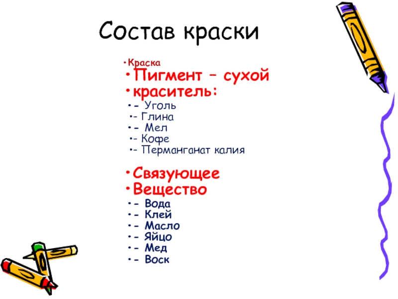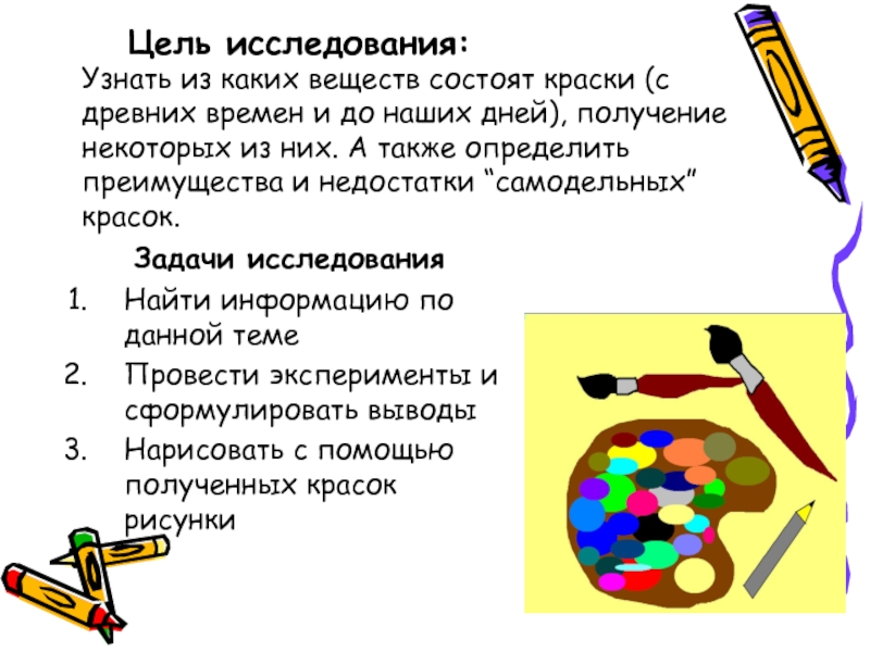Узнать из каких веществ состоят краски (с древних времен и до наших дней), получение некоторых из них. А также определить преимущества и недостатки “самодельных” красок.