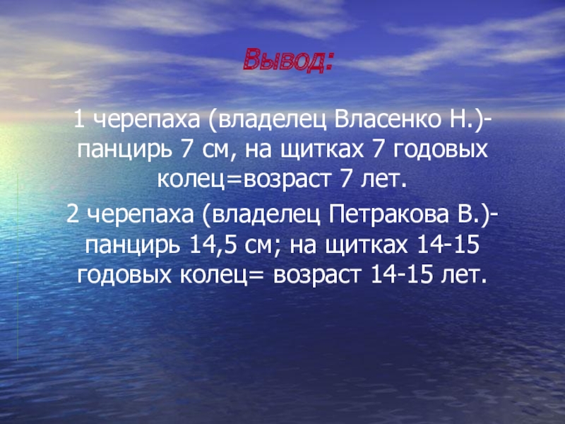 3.Точно узнать возраст черепахи, которую не выращивали с рождения, невозможно, но приблизительно его определяют по длине панциря и по концентрическим годовым кольцам. По измерению панциря и подсчёту концентрических колец на щитках, мы определили возраст наших черепах -7 и 14-15 лет.