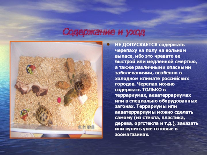 ибо это чревато ее быстрой или медленной смертью, а также различными опасными заболеваниями, особенно в холодном климате российских городов. Черепах можно содержать ТОЛЬКО в террариумах, акватеррариумах или в специально оборудованных загонах. Террариумы или акватеррариумы можно сделать самому (из стекла, пластика, дерева, оргстекла и т.д.), заказать или купить уже готовые в зоомагазинах.