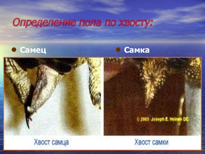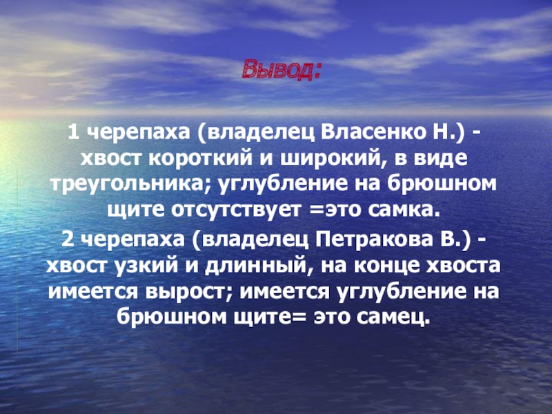 По строению хвоста мы сравнили черепах (хвост у самцов намного уже и длиннее, а клоака имеет форму продольной полосы, панцирь над хвостом загибается к земле. У самок же маленький короткий хвост, а клоака по форме напоминает звёздочку.)