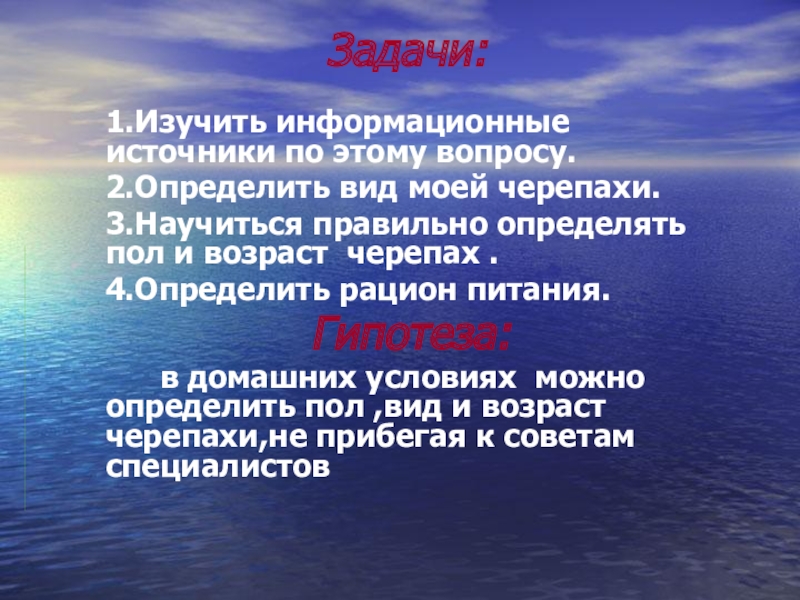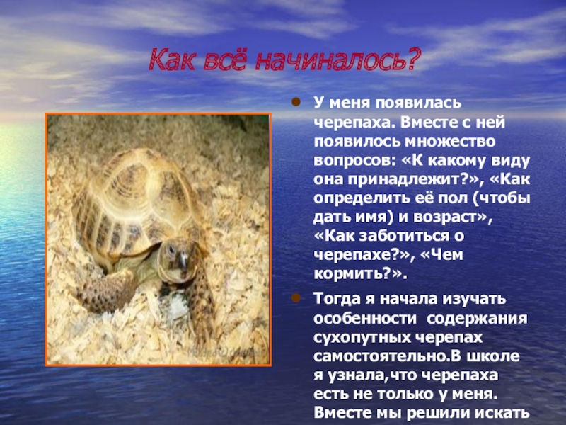 вопросов: «К какому виду она принадлежит?», «Как определить её пол (чтобы дать имя) и возраст», «Как заботиться о черепахе?», «Чем кормить?».