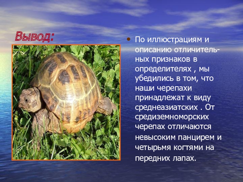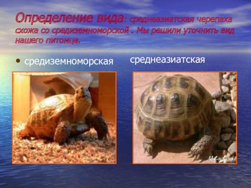 Слайд 8Определение вида: среднеазиатская черепаха схожа со средиземноморской . Мы решили уточнить