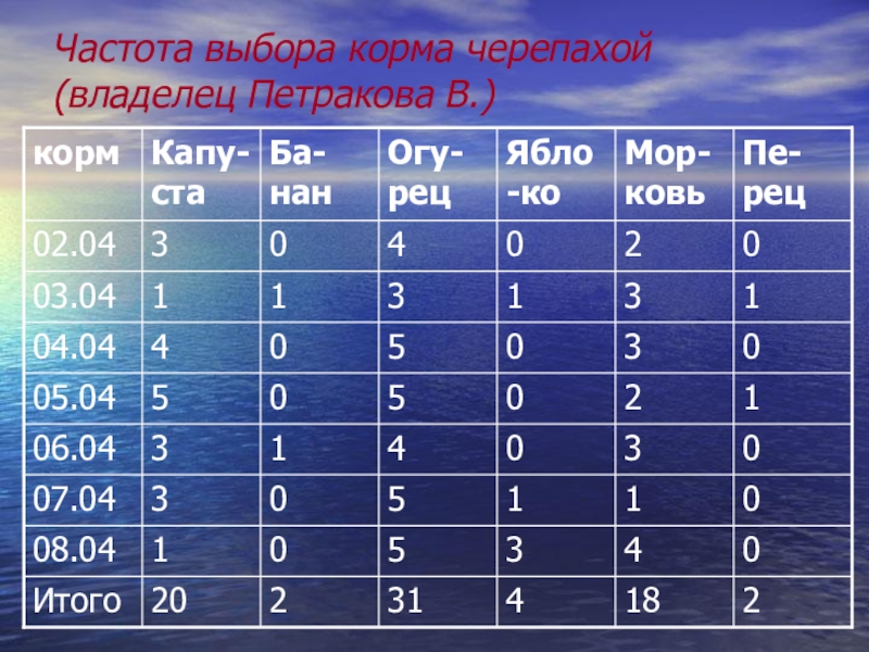 Слайд 19Частота выбора корма черепахой (владелец Петракова В.)