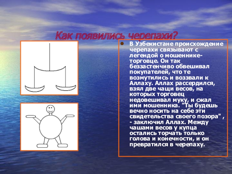 Он так беззастенчиво обвешивал покупателей, что те возмутились и воззвали к Аллаху. Аллах рассердился, взял две чащи весов, на которых торговец недовешивал муку, и сжал ими мошенника. "Ты будешь вечно носить на себе эти свидетельства своего позора" , - заключил Аллах. Между чашами весов у купца остались торчать только голова и конечности, и он превратился в черепаху.