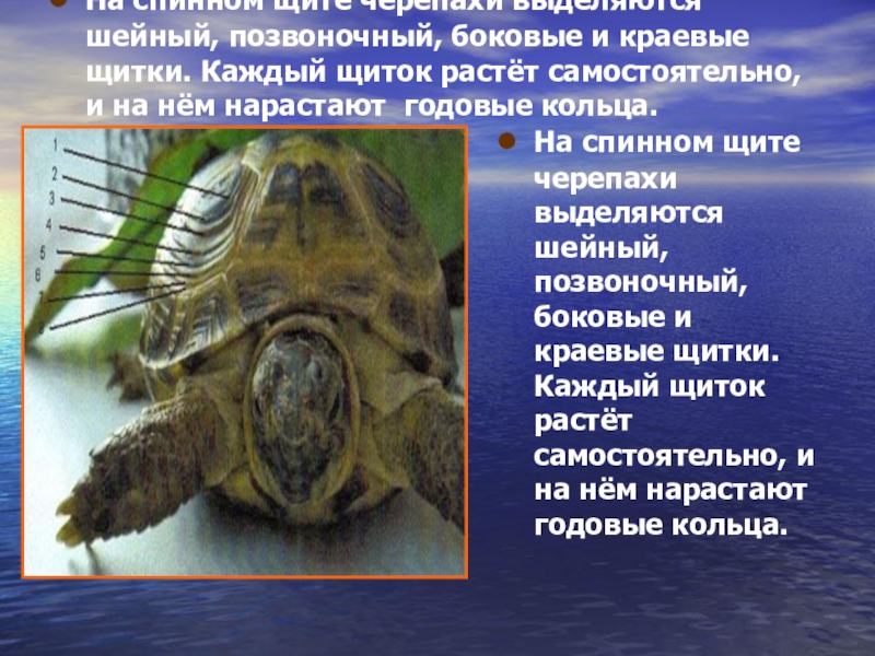 На спинном щите черепахи выделяются шейный, позвоночный, боковые и краевые щитки. Каждый щиток растёт самостоятельно, и на нём нарастают годовые кольца.