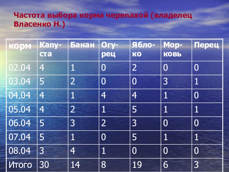 Слайд 18Частота выбора корма черепахой (владелец Власенко Н.)