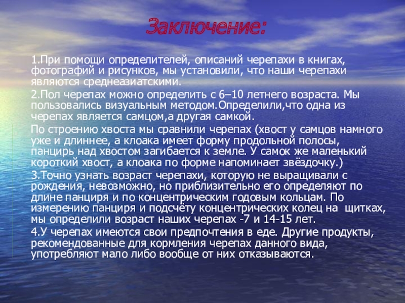 Тогда я начала изучать особенности содержания сухопутных черепах самостоятельно.В школе я узнала,что черепаха есть не только у меня.Вместе мы решили искать ответы на наши вопросы.