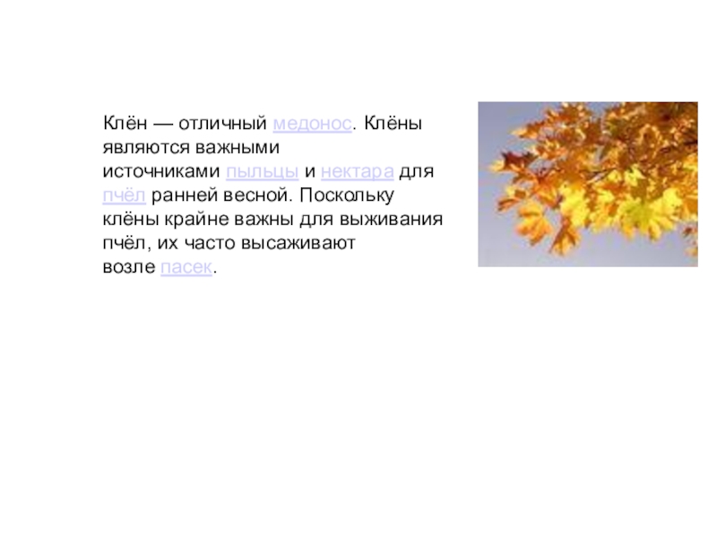Клён — отличный медонос. Клёны являются важными источниками пыльцы и нектара для пчёл ранней весной. Поскольку клёны крайне важны для выживания пчёл, их часто высаживают возле пасек.