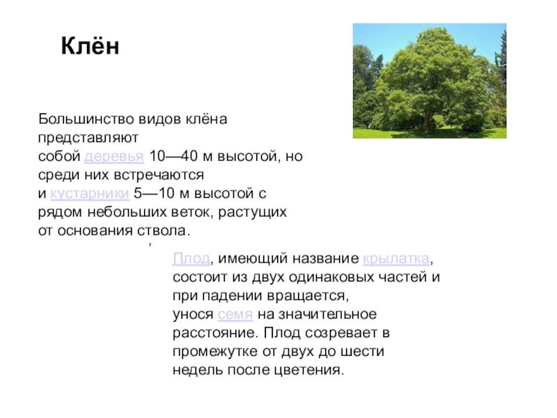 Плод, имеющий название крылатка, состоит из двух одинаковых частей и при падении вращается, унося семя на значительное расстояние. Плод созревает в промежутке от двух до шести недель после цветения.