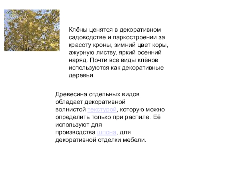 Древесина отдельных видов обладает декоративной волнистой текстурой, которую можно определить только при распиле. Её используют для производства шпона, для декоративной отделки мебели.
