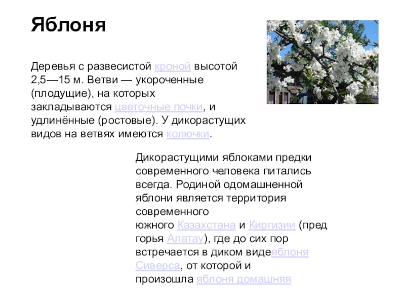 Дикорастущими яблоками предки современного человека питались всегда. Родиной одомашненной яблони является территория современного южного Казахстана и Киргизии (предгорья Алатау), где до сих пор встречается в диком видеяблоня Сиверса, от которой и произошла яблоня домашняя