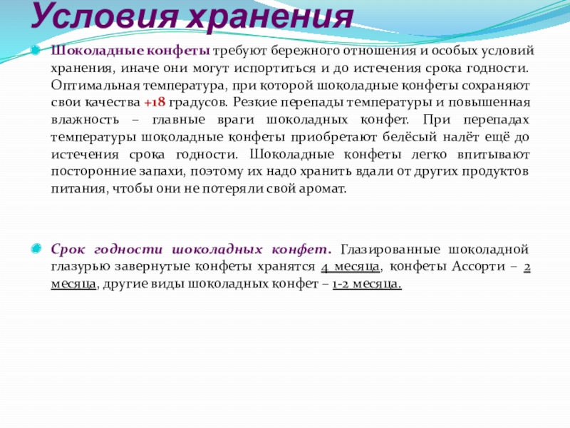 они могут испортиться и до истечения срока годности. Оптимальная температура, при которой шоколадные конфеты сохраняют свои качества +18 градусов. Резкие перепады температуры и повышенная влажность – главные враги шоколадных конфет. При перепадах температуры шоколадные конфеты приобретают белёсый налёт ещё до истечения срока годности. Шоколадные конфеты легко впитывают посторонние запахи, поэтому их надо хранить вдали от других продуктов питания, чтобы они не потеряли свой аромат.