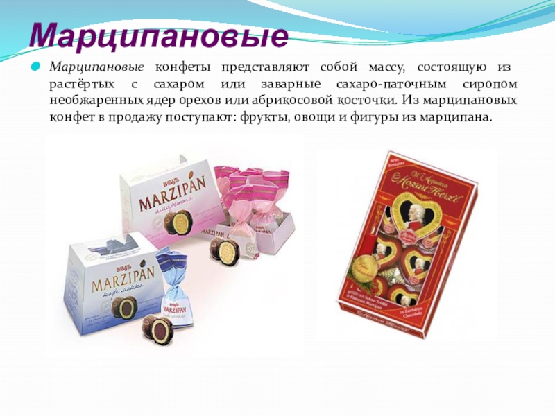 заварные сахаро-паточным сиропом необжаренных ядер орехов или абрикосовой косточки. Из марципановых конфет в продажу поступают: фрукты, овощи и фигуры из марципана.