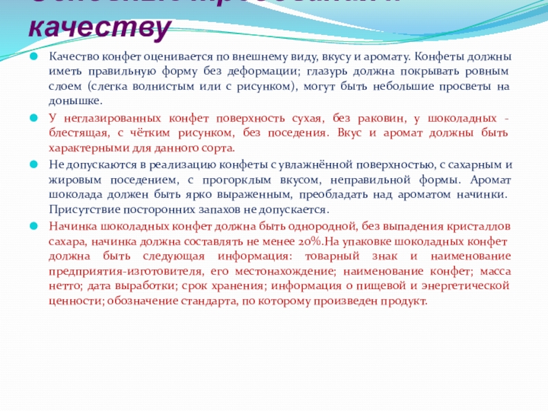 Начинка шоколадных конфет должна быть однородной, без выпадения кристаллов сахара, начинка должна составлять не менее 20%.На упаковке шоколадных конфет должна быть следующая информация: товарный знак и наименование предприятия-изготовителя, его местонахождение; наименование конфет; масса нетто; дата выработки; срок хранения; информация о пищевой и энергетической ценности; обозначение стандарта, по которому произведен продукт.