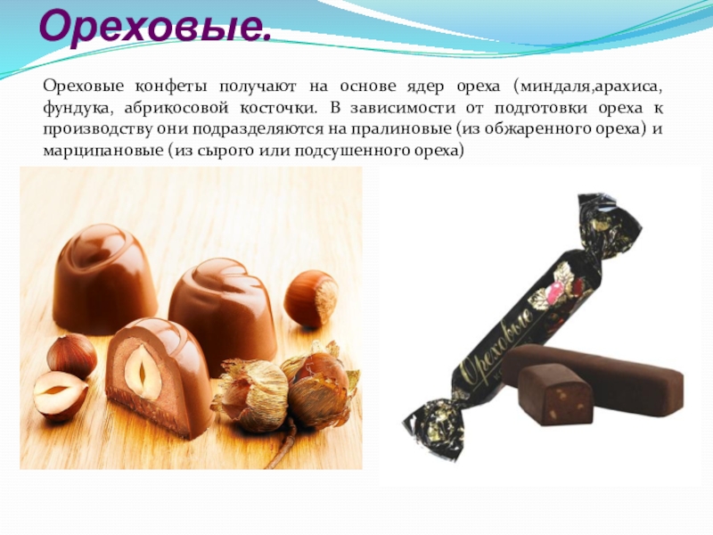 Ореховые конфеты получают на основе ядер ореха (миндаля,арахиса, фундука, абрикосовой косточки.