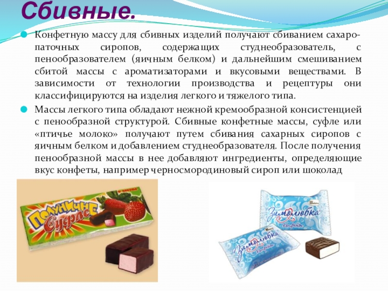 с пенообразователем (яичным белком) и дальнейшим смешиванием сбитой массы с ароматизаторами и вкусовыми веществами. В зависимости от технологии производства и рецептуры они классифицируются на изделия легкого и тяжелого типа.