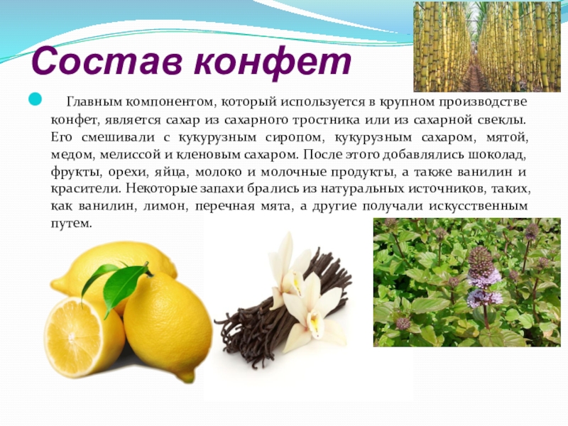 сахар из сахарного тростника или из сахарной свеклы. Его смешивали с кукурузным сиропом, кукурузным сахаром, мятой, медом, мелиссой и кленовым сахаром. После этого добавлялись шоколад, фрукты, орехи, яйца, молоко и молочные продукты, а также ванилин и красители. Некоторые запахи брались из натуральных источников, таких, как ванилин, лимон, перечная мята, а другие получали искусственным путем.