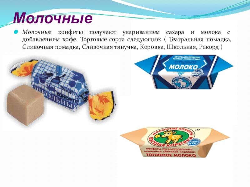 Молочные конфеты получают увариванием сахара и молока с добавлением кофе. Торговые