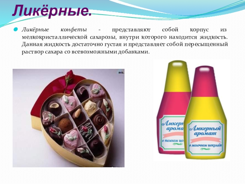 Ликёрные конфеты - представляют собой корпус из мелкокристаллической сахарозы, внутри которого