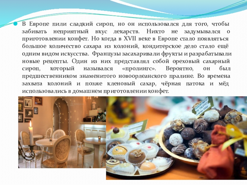 забивать неприятный вкус лекарств. Никто не задумывался о приготовлении конфет. Но когда в XVII веке в Европе стало появляться большое количество сахара из колоний, кондитерское дело стало ещё одним видом искусства. Французы засахаривали фрукты и разрабатывали новые рецепты. Один из них представлял собой ореховый сахарный сироп, который назывался «пролингс». Вероятно, он был предшественником знаменитого новоорлеанского пралине. Во времена захвата колоний и позже кленовый сахар, чёрная патока и мёд использовались в домашнем приготовлении конфет.